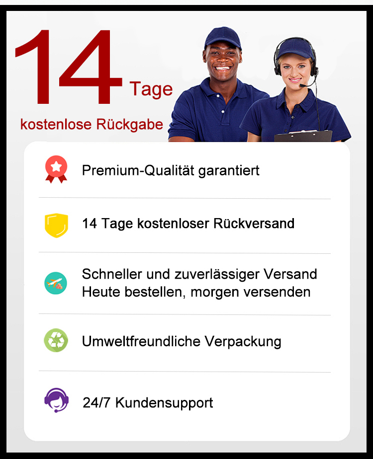 Sollten Sie mit der erhaltenen Ware nicht zufrieden sein, können Sie sich jederzeit an unseren Kundenservice wenden, um das Produkt zurückzusenden oder eine Rückerstattung zu erhalten.